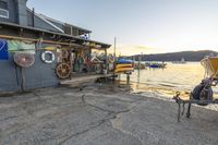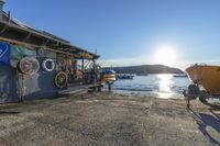 A tranquil coastal landscape at dawn with a beautiful lake shore, clear sky, and sun visible