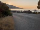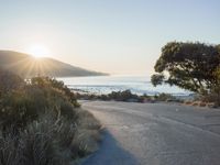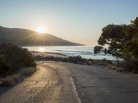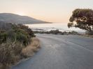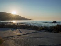 A winding highway running along the ocean shore, with a backdrop of foggy mountains and a clear sky. The sun is setting, creating a beautiful evening scene of trees, vegetation, and snow covered terrain.