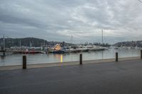 A gloomy day at a coastal harbor with boats docked, surrounded by a fence and grey sky.