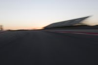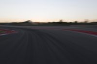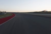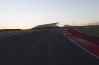 A red automobile moves along a curved, controlled access highway towards a sunlit horizon at dawn. The sea meets the sand in the background as the coastal infrastructure stretches out straight down the road.
