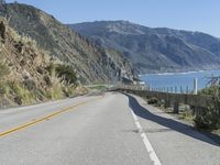 A stretch of the Pacific Coast Highway in Big Sur, California, USA, featuring a metal Armco barrier and bridge with a curved humpback design, against the backdrop of rolling hills, cliffs, and a clear blue sky.