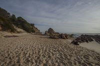 A stunning coastal landscape at dawn, showcasing the beautiful wood terrain and bedrock formations. The serene beach is surrounded by lush vegetation and tall trees, with the sun visible on the horizon, casting a warm sunlight over the sandy shore and clear ocean waters. This scenic spot offers plenty of recreational opportunities in nature's open space, perfect for enjoying the sunny atmosphere and breathtaking views of the mountain highland.