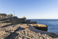 A breathtaking view of the coastal landscape at dawn, with the azure ocean water meeting the rocky cliffs and bedrock surface.
