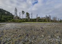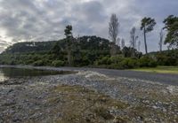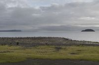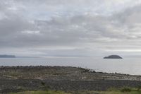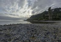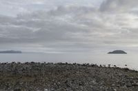 A serene coastal landscape at dawn, showcasing an open space with a calm ocean, gentle waves, and a grey sky in the background.