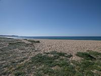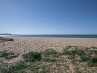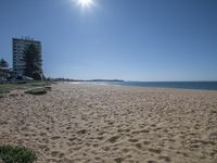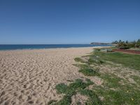 A breathtaking coastal landscape with sandy beach, clear blue water, and lush vegetation under a sunny azure sky.