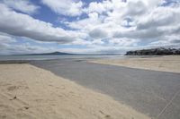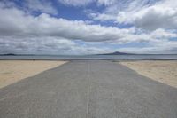 A breathtaking view of a coastal landscape with azure water, grey cumulus clouds, and a straight road leading into the horizon.