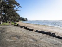 A scenic view of the coastal landscape in California, USA. The sandy beach meets the clear blue waters of the ocean, creating a picturesque scene. The surrounding natural environment includes forests, trees, and rocky shores. Visitors can enjoy recreational activities in the open spaces and state parks. The road leading to the beach is lined with vegetation, providing a scenic drive to the shore. This idyllic location is perfect for a vacation or a peaceful getaway.