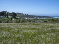A breathtaking view of the rugged California coast, showcasing the lush green grass, open spaces, and beautiful ocean waters.