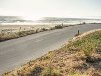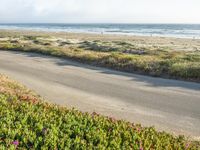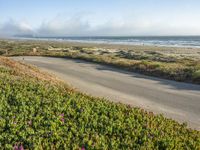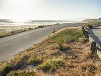 A scenic view of the California coast with an asphalt road winding through sandy beaches, grassy dunes, and crystal-clear waters under a sunny sky.
