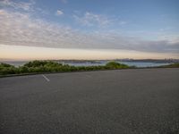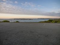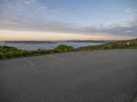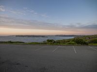 A stunning coastal landscape at dawn with a road leading to an open space parking lot near the water.