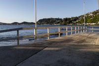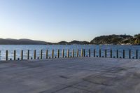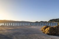 A serene coastal landscape at dawn, with the sun visible on the horizon and clear skies above. The calm sea meets the shore, creating a picturesque scene of nature and tranquility.