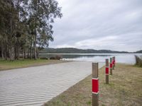A gloomy day at the coastal landscape with a pier extending into the ocean under a grey sky.