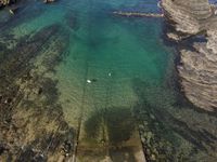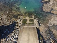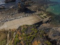 Aerial view of the coastal landscape in Portugal with a watercourse, mountain landforms, beach, lake, headland, road, asphalt, soil, sky, azure, dirt, gravel, wave, horizon, sand, lake, klippe, city, thoroughfare, urban design, walkway, composite material, concrete, pollution, reservoir, natural environment, land lot, bird's-eye view, air travel, wood, and open space.
