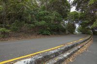 A scenic coastal landscape with a road winding through the trees on a gloomy day