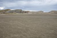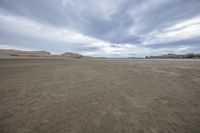 A beautiful coastal landscape with sand, water, and open space. The beach stretches out into the horizon, surrounded by the ocean and cumulus clouds in the sky.
