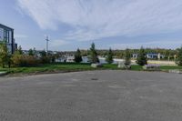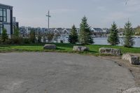 A scenic view of the coastal landscape in Toronto, Canada. The image showcases the beautiful water, grassy plains, and residential buildings in the area.