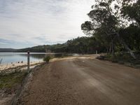 Scenic view of a coastal landscape in Wallagoot Lake, located in the Sapphire Coast region of New South Wales, Australia. The sandy shores and crystal-clear water create a serene and natural setting. A winding road cuts through the picturesque scenery, surrounded by lush vegetation and towering trees. The blue sky with fluffy white clouds adds to the beauty of this idyllic location.