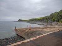 Scenic view of a coastal landscape with a wooded shoreline, calm lake, and cloudy sky