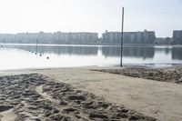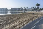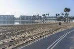 A picturesque view of the coastal reflection in Los Angeles, California, USA, with the concrete shore, sandy beach, and clear sky on a sunny day.