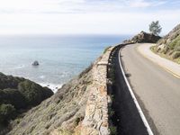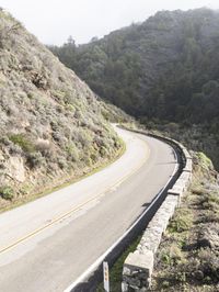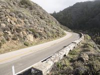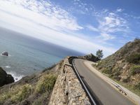 A highway curves along the coast of Big Sur, California, USA, with the Pacific Ocean in the background. An Armco Barrier walls the elevated road, with a bridge in the distance and the rocky shoreline visible along the horizon. Nature and infrastructure meet in this wild landscape of mountains, cliffs, headlands, and outcrops.