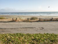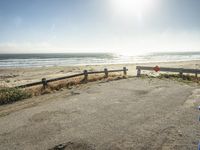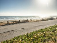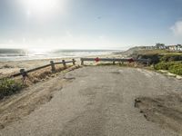 Scenic view of a coastal road in California, USA. The asphalt road winds along the shore, surrounded by sand, water, and vegetation. The clear sky and sunshine create a beautiful contrast with the gloomy fog and grey sky in the distance. Mountains, grass, trees, and fences add to the natural environment of this peaceful and calm coastal destination.