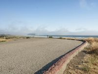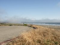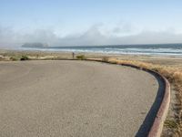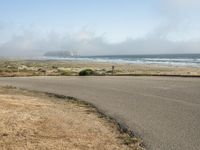 A scenic view of a coastal road surrounded by sandy beaches, clear blue water, and foggy skies in California, USA.