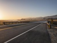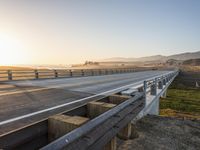 Scenic view of a coastal road at dawn in California, USA, with the asphalt road curving along the ocean coast. The clear sky and sunlight illuminate the landscape, highlighting the horizon and the bridge in the distance.
