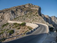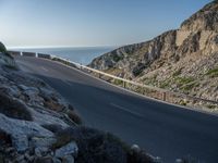 At the break of day, a road with an Armco barrier and guard rail winds through the Mallorca coastline of the Balearic Islands in Spain, surrounded by a clear sky and hard shadowed mountains with asphalt and water in the foreground.