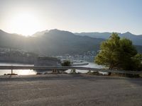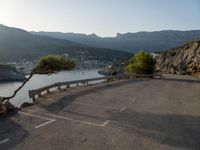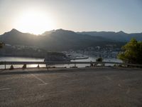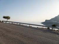 An elevated view from above of a winding asphalt road with an Armco barrier, leading to the harbor in Mallorca, Balearic Islands, Spain. The clear blue sky and sunshine reflects off the ocean, with a jetty and parking lot in the distance, providing a peaceful coastal landscape.