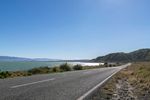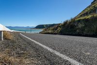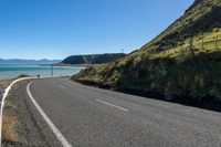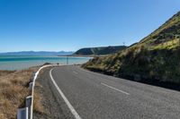 A scenic coastal road in New Zealand, with clear skies and the ocean water reflecting the low sunlight of the day, surrounded by greenery and asphalt.