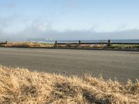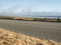 Scenic view of a coastal road in California, USA, surrounded by grass, trees, and a foggy horizon