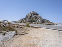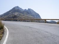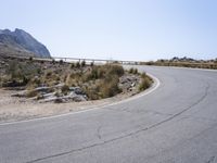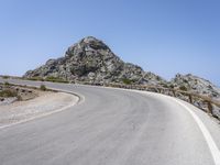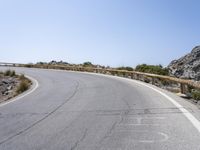 A scenic mountain road with asphalt surface, guard rails and Armco barrier winding through the Mallorca region of the Balearic Islands in Spain, with a clear sky and the ocean in the background. The landscape is made of rocky mountains, hills, highlands, valleys, reservoirs, wadis and other landforms, with a mix of trees, bridges, nonbuilding structures, tar and concrete.