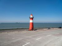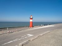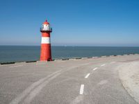 A tranquil landscape of the Dutch coast, featuring a composite material road, a lighthouse tower, and a bicycle wheel against a clear azure sky and calm ocean horizon.
