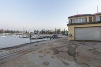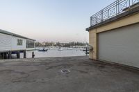 The dawn breaks over the coastal city, casting a warm glow on the pier and reflecting off the calm ocean waters.