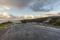 A stunning view of the dawn breaking over a highland cliff along the coastal region. The golden sunlight illuminates the water's surface, creating a breathtaking landscape of open space and natural beauty.