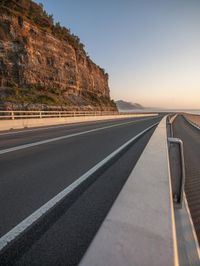 The dawn breaks over the coastal landscape, illuminating the asphalt road that winds along the water's edge. A stunning display of nature and sunlight over the ocean, with wooden guard rails guiding the way. The road surface is smooth and tarred, creating a perfect thoroughfare for recreation and exploration. The clear sky and distant mountains complete the breathtaking horizon.