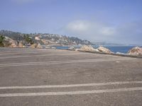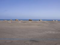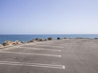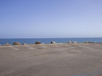 A serene coastal view of a parking lot in Los Angeles, California, USA. The open space, asphalt surface, and clear sky create a calm and recreational atmosphere.
