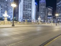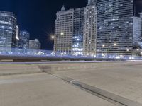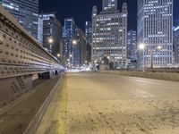 A night view of the urban skyline of Chicago, Illinois, USA, illuminated by artificial light and featuring a roadway lined by Armco barriers and building high-rises.