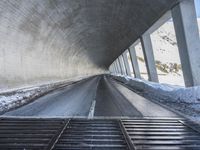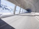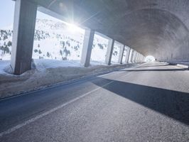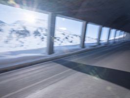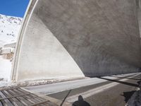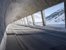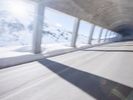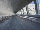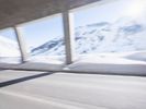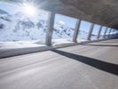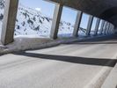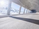 A view of a modern composite material and concrete bridge connecting two cities in the German Alps, with a fixed link, road surface, and infrastructure in the background. A snowy mountain range and clear blue sky provide a natural backdrop for this urban landscape.