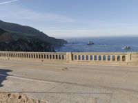 The road winds its way through the coastal landscape, connecting the mountain to the shoreline. A concrete bridge, breakwater, boardwalk, and guard rail are seen against the backdrop of an ocean, sea, beach, and clear sky, complete with contrails and hard shadows. The sandy terrain and headland provide a dramatic horizon of the land and shore.