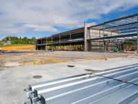 A view of a construction site with clouds in the background, featuring concrete surfaces and open spaces in a city.