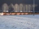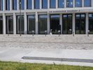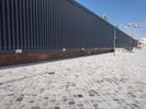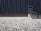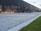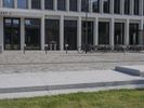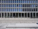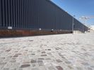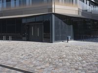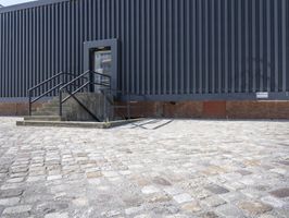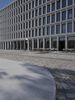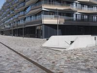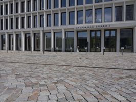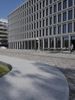 A view of the modern architecture and mixed-use properties of the residential area in Berlin, Germany on a clear day. From the cobblestone roads and road surfaces to the colorful facades of the apartment buildings, office buildings and houses, this urban design has a unique material property with a stadium, public space and open area. The contrails of the city add a unique line to the cityscape.