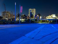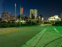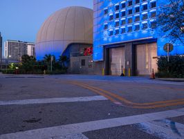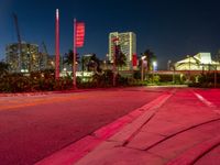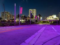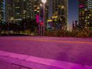 A person is seen crossing the street in Miami, USA, during the break of day. The cityscape is illuminated by artificial light, neon signs, and street lights, with modern architecture and urban design in the background. Long streaks of light and motion blur capture the energy of the city life.