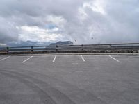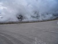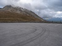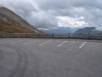 A dramatic view of a frozen lake in the Austrian highlands, with an armco barrier, bridge and mountain range in the background. This scenic landscape is a popular destination for recreation, with a parking lot and open space providing access to the water resources, trees and vegetation, as well as a mode of transport along the road surface.