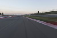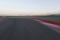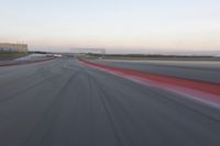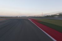 A winding road with a red automobile on it, stretches through a landscape of sand, sea, and a grandstand stadium. The asphalt highway creates an S-curve running through a clear sky with a dome in the horizon, providing a mode of transport with its infrastructure of lanes, curves, and switchbacks.