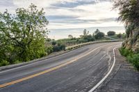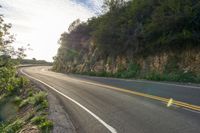 The sun rises over the S-curve of the road, winding through the mountains and nature of California, USA. The rock wall and low sunshine make for a stunning landscape, with the contrails of a plane visible in the sky above.