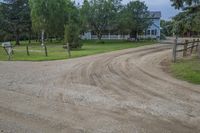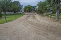 A winding country road in the rural town of Bancroft, Iowa. The road surface is composed of a variety of materials, including asphalt, gravel, soil, and grass. Trees line the roadside, and a grey sky hangs above the real estate and agricultural landscape.