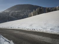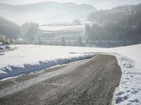 A winding road stretches through the German Alps in the morning, illuminated by the sun's rays and surrounded by snowy mountains, trees, and fog.