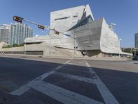 A view of the Dallas cityscape featuring a mix of modern architecture, Brutalist structures, and elevated roads, with a bustling business district, residential area, and museum in the background. Clear skies and open space provide a great view of the urban infrastructure and design.