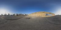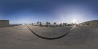 Cityscape of Barcelona at dawn, with low coastal concrete walls and the ocean as the backdrop